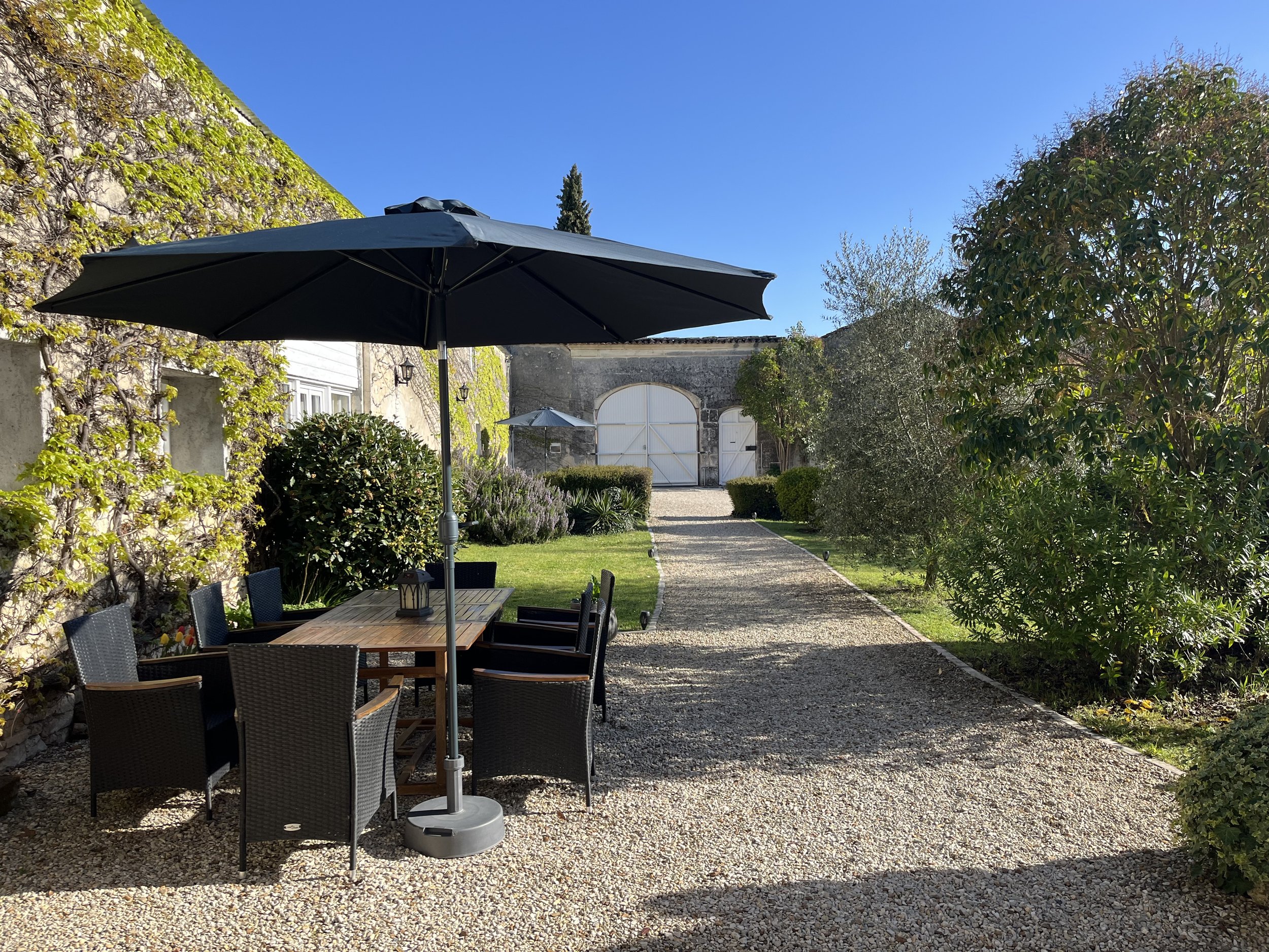 In addition to a large dining table inside, each gite has its own exterior private dining area with comfy chairs & parasols just outside their front door in the courtyard.